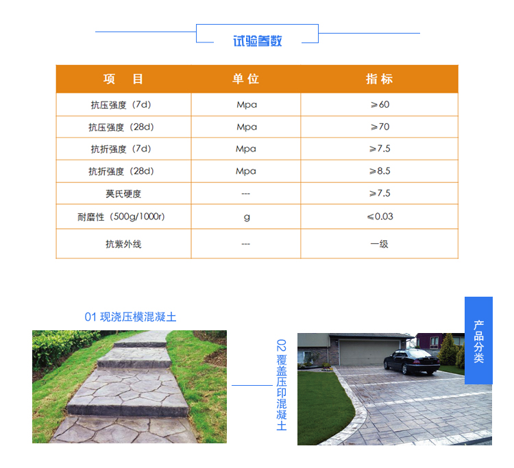 彩色混凝土压花,压印,压模地坪产品是一种全新施工理念的彩色混凝土装饰面层材料,图案和颜色任意组台,整体成型一次性铺装,抗压强度一般可达普通混凝土的3倍以上,耐磨、抗压性好。