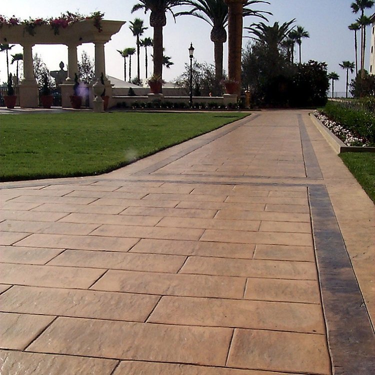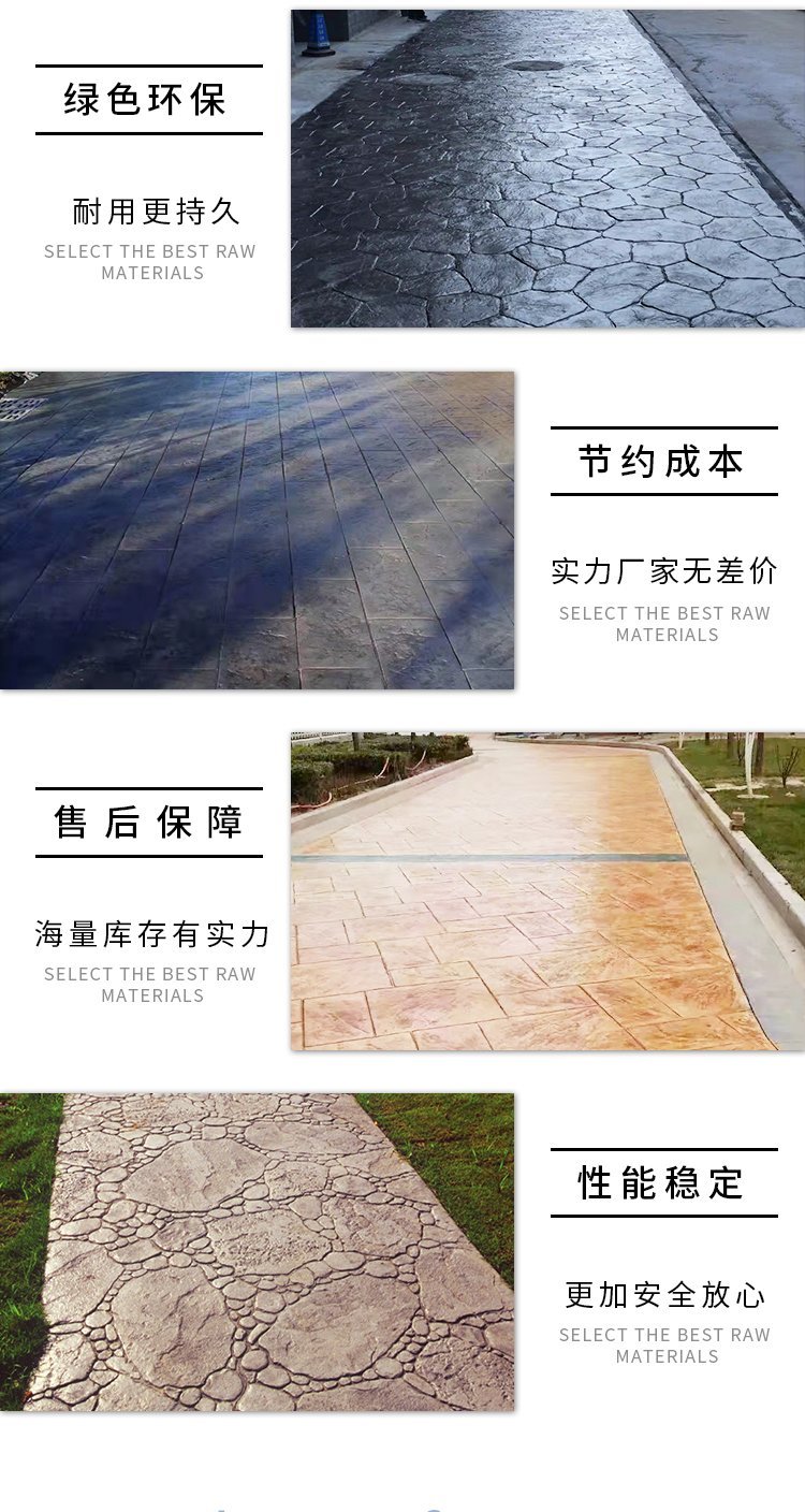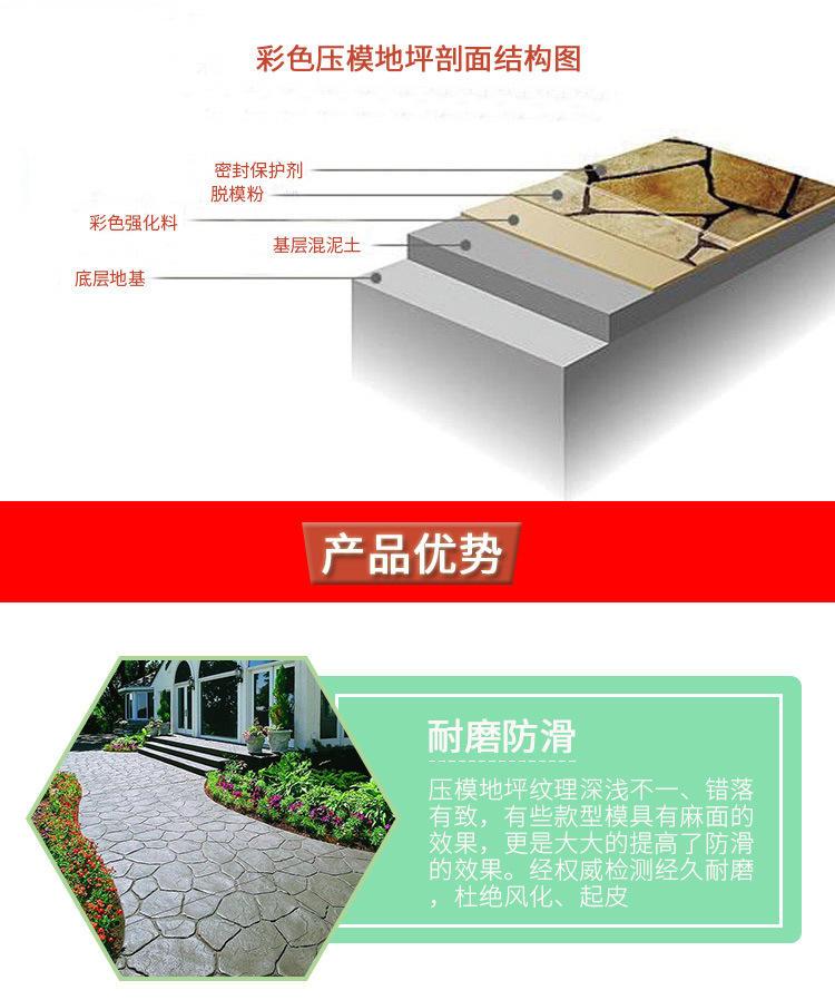 广东大来生态科技集团有限公司(简称:大来生态)彩色压花地坪也叫压模地坪,压印地坪,压花地坪。压花地坪是以现有图案框架一体成形的压花地坪系列,用现浇混凝土地面以特制模具有彩色印花料,采用先进的技术、配合严谨的施工管理,制作而成。它展现了多彩多姿的图案模型及丰富变化的色彩,更具有防油、防水、防滑,表面不会开裂、脱落、褪色,耐磨性好的效果及一体成型的特性,适用性非常广泛。
