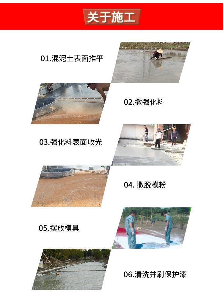 3.混凝土初凝前,以镘刀将混凝土镘平,以撒布法将彩色印花料按规定用量平均分二至三次均匀撒布于混凝土面层,每次均匀以专用镘刀进行镘平、镘光工作。