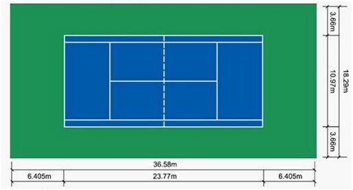 国际网联和国家体委颁布的《网球竞赛规则》中规定,一片标准网球场地占地面积不小于36.58米(长)×18.29米(宽),这个尺寸也是一片标准网球场地四周围挡网或室内建筑内墙地面的净尺寸。在这个面积内,有效双打场地的标准尺寸是:23.774米(长)×10.973米(宽),在每条端线后应留有空余地不小于6.40米,在每条边线外应留有空余地不小于3.66米。在球场中心安装网柱,两柱中心测量,柱间距是12.80米,网柱顶端距地平面是1.07米,球网中心上沿距地平面是0.914米。