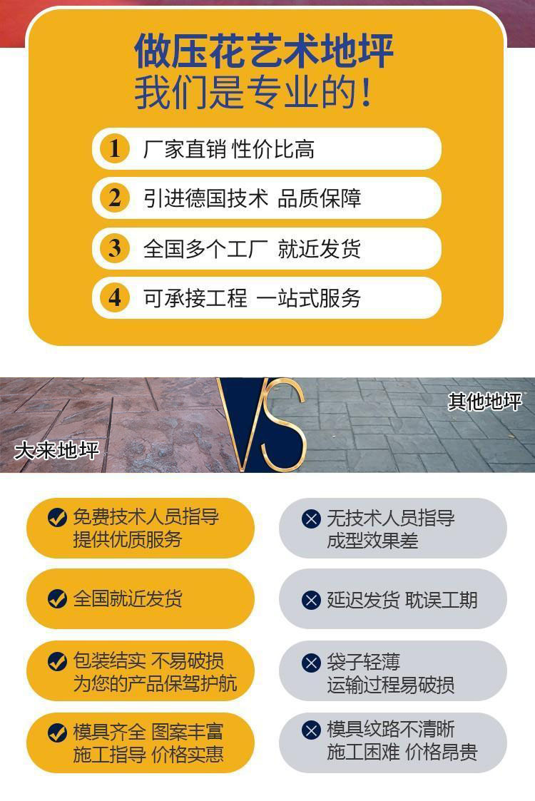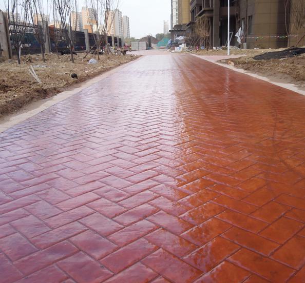 艺术压印地坪在原有的混凝土基础上展现出了多彩多姿的图案模型及丰富变化的色彩,致使路面更具有耐磨、耐压、防滑、不鼓胀、耐碱水、防尘不长青苔的特性,应用范围广泛。