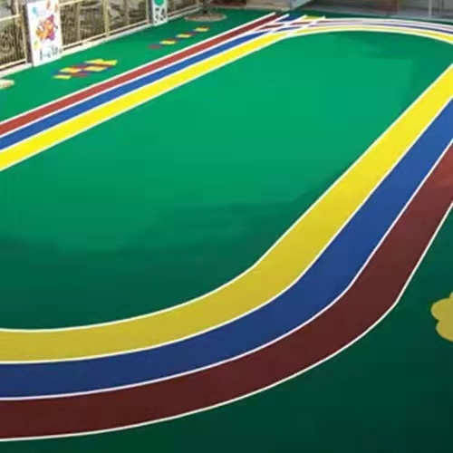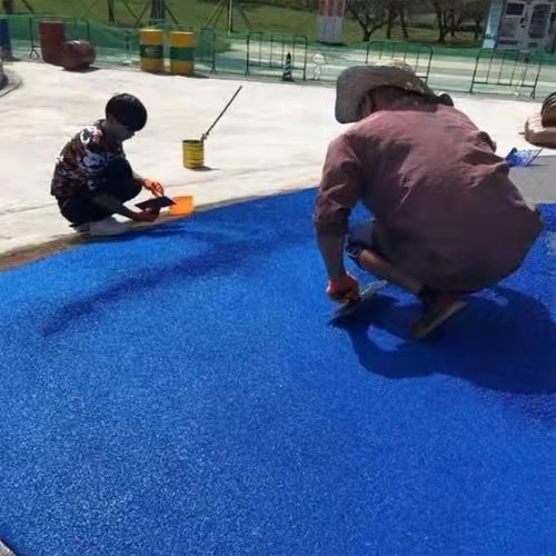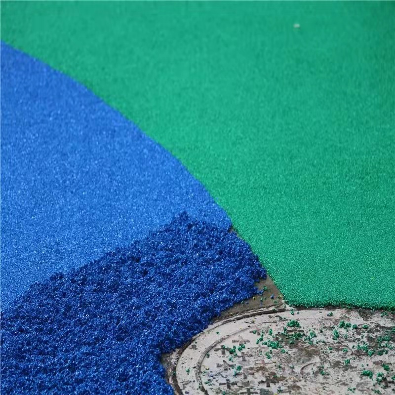 6) 一定要严格按照比例进行配料。视颗粒情况而定,好的用胶水少,差的用胶水多;大的用量少,小的用量多。底层橡胶颗粒:胶水=6-8:1;面层EPDM颗粒:胶水=5-6:1,催化剂一般不需要加,如环境温度低于10℃时,可适当加入5-10‰。