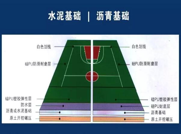 硅PU球场:适用于篮球、羽毛球、乒乓球、排球、室内足球、手球、幼儿园、健身房、医院、宾馆等室内外场地,可直接在水泥混凝土上铺设,一般能使用8年以上。