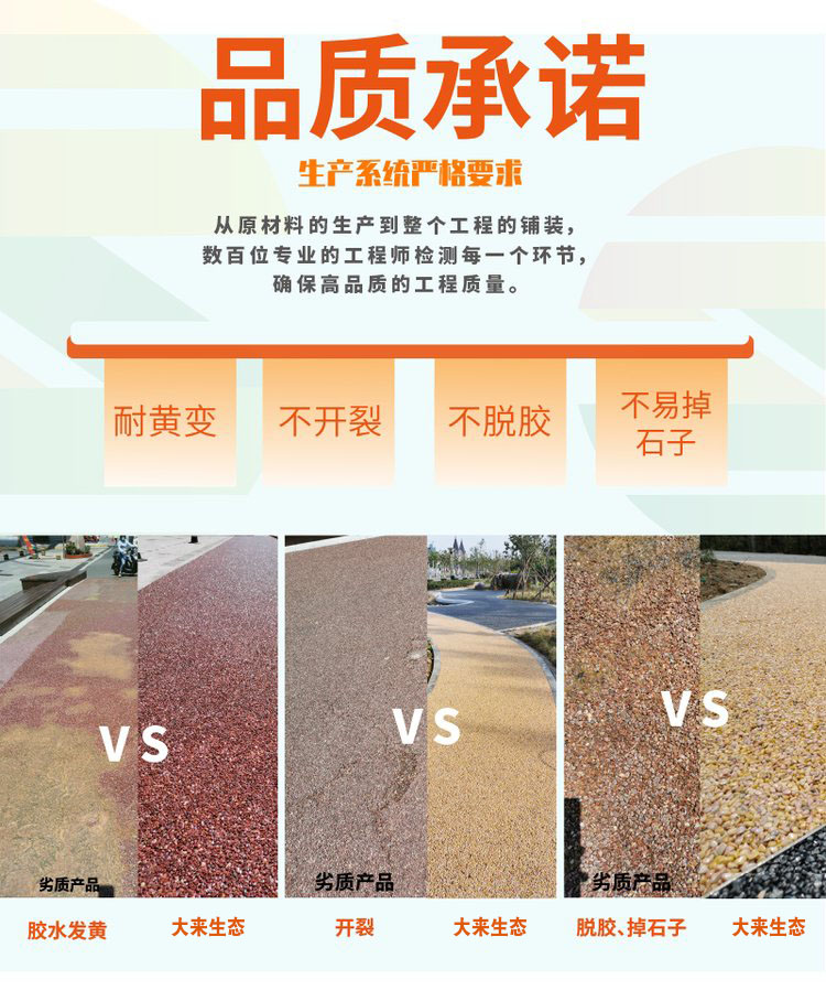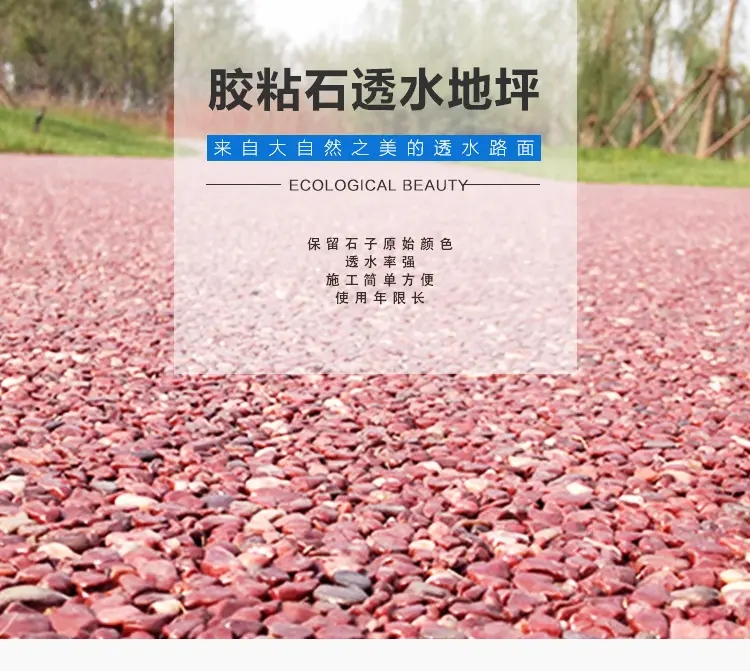 透水胶粘石通俗的说,就是用透明的专用配方胶水把水洗后的彩色石子粘结在一起形成块状的地坪,但是对胶水品质和配比要求都特别高。