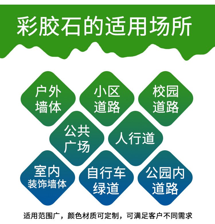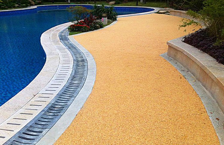 透水胶粘石地坪路面应用领域广泛:室外景观地面、游泳池池底、彩石夜光道路铺装,透水树池(树洞),室内石毯、墙面工程装饰等都可见。
