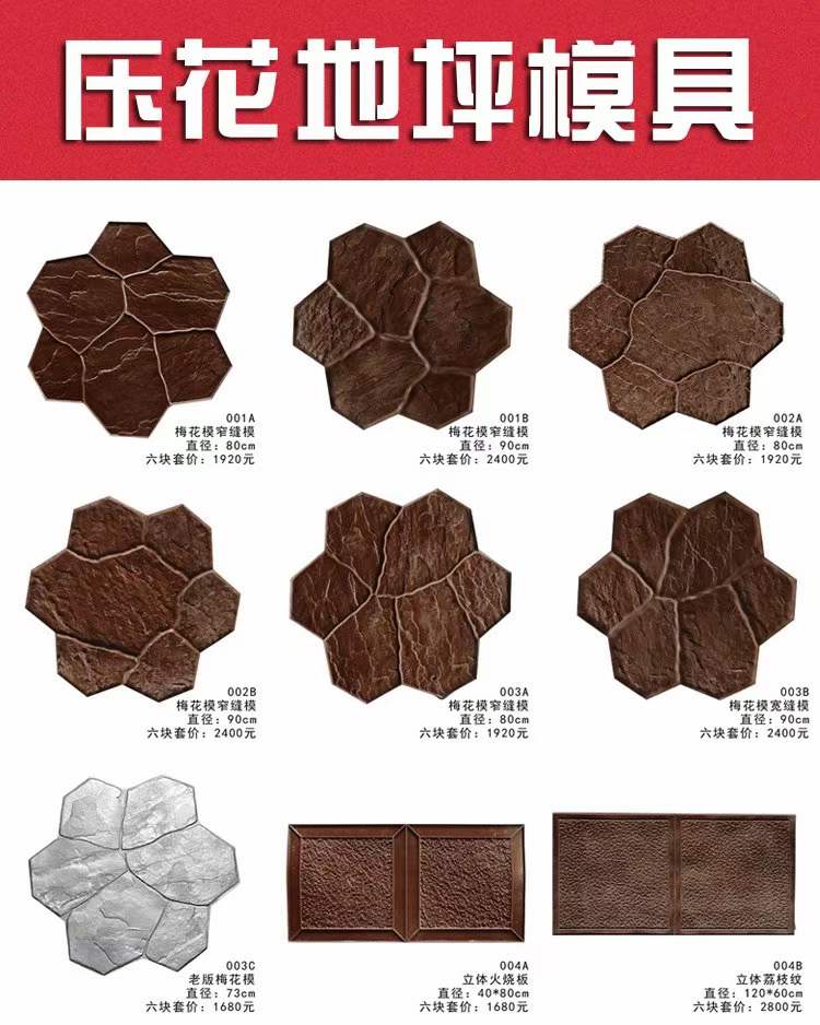 首先就是通过出厂前制作好的石纹凹凸质感模具,在巧妙的利用彩色耐磨粉、脱模粉的作用,快速赋予混凝土未干的表面上出现天然石材效果,制作出各式各样的图案效果,仿生度高达99%,几乎可以假乱真。模具就是这个样子的,市场上现在已经高达上千款式了。
