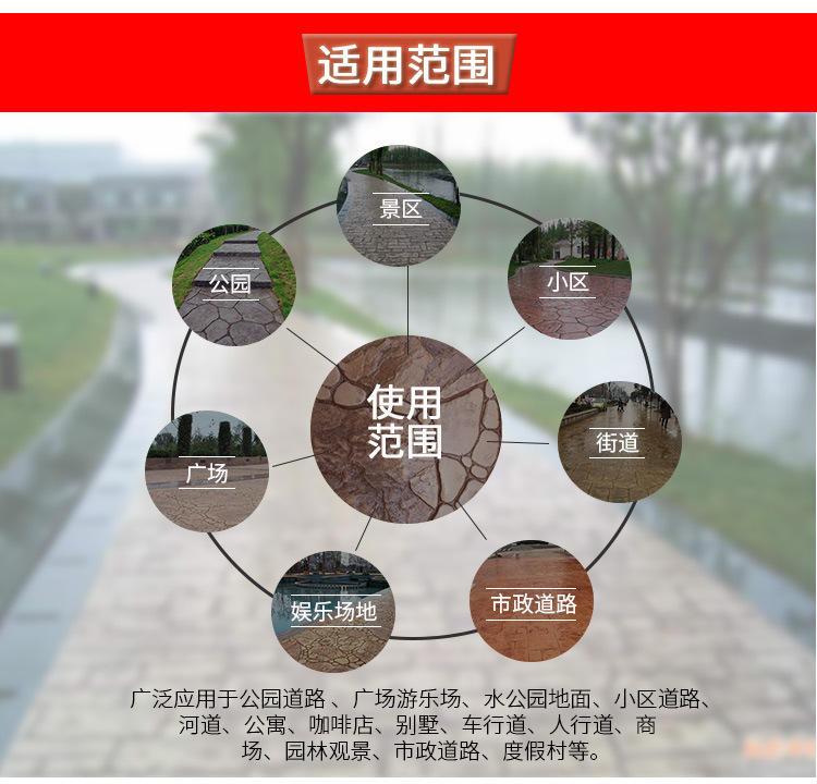 相比传统路面的zui大的优点在于是使用广泛性,其中在还具备非常好的不褪色性,若是碰见下雨天,在进行清洗后,依然会亮丽如新,同时给城市添加风采,绝不会出现掉色褪色现象。