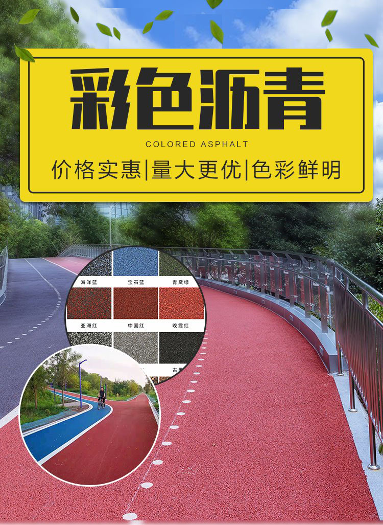 彩色透水冷拌沥青是一种高科技道路铺装,核心材料源自国内,性质稳定,粘度大,可在-30"C至50C之间全天候使用。适用于各种复杂天气和环境,各种不同类型的道路面层,如沥青、水泥混凝土道路、检查井、停车场、机场跑道等。