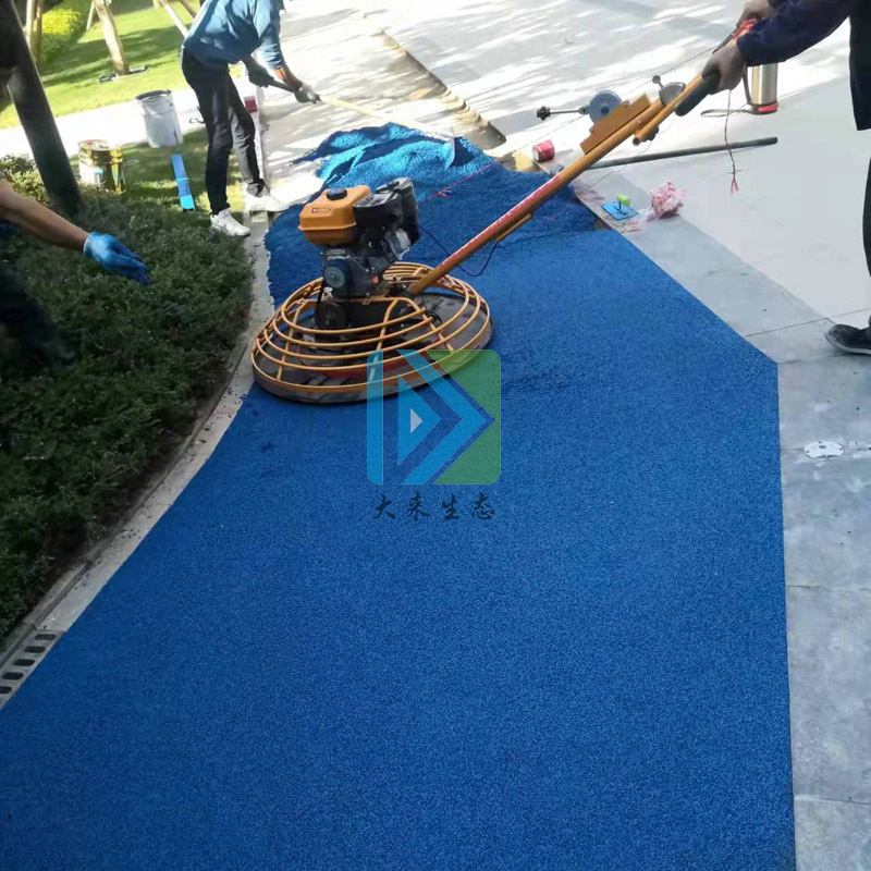 这次黄埔大沙地护林路到天河区中山大道段透水地坪绿道的铺装主要材料使用的是广东大来透水混凝土和冷铺型高粘透水沥青材料,其组合结构是底层铺装透水混凝土,面层是冷铺型高粘透水沥青材料,颜色选择的是蓝色,十分具有时代色彩。