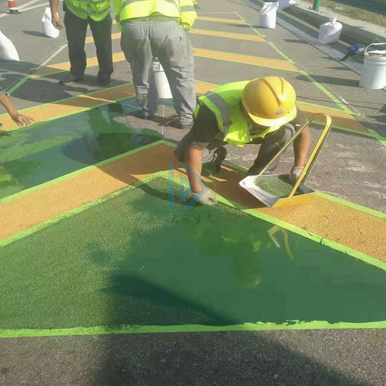 1、清理路面。2、胶水混合。3、贴防护胶带。4、刮涂粘合剂。5、抛洒骨料。6、清除防护胶带。7、清扫多余骨料。8、贴防护胶带。9、涂面漆。10、清除防护胶带。11、开放交通