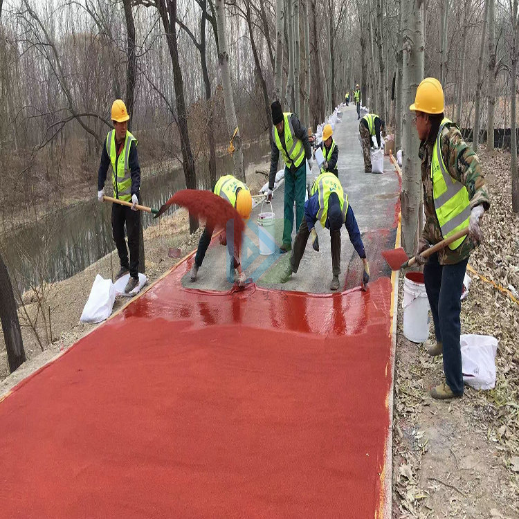 4、耐磨性优异:特殊的聚氨酯耐磨树脂与耐磨防滑骨料的配合,大大的提高了防滑系数,彩色防滑路面性能指标更高,性价比更高。