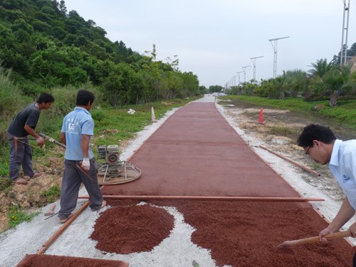 5、伸缩缝用弹性胶(对应颜色)填充至低于地面1-2mm左右的高度,然后用快干硬漆抹光机抹平;透水地坪伸缩缝,接缝内的地坪应平整至低于地面1-2mm的深度,然后用快干硬漆腻子抹平,以免发生反碱现象。