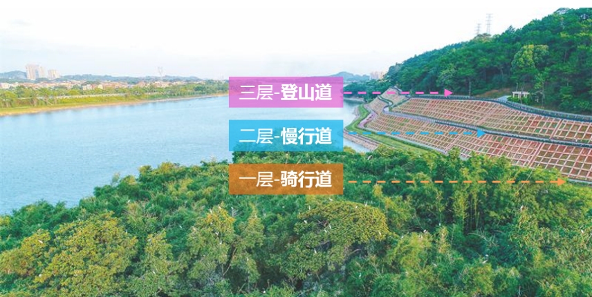 设计将水安全与生态、景观游憩相廊道相结合,首串“三层立体碧道”,一层:亲水道,为骑行道,是贯通圣皇洲广场和观海长廊的主要道路。二层:位于半山腰的慢行步道,是边坡主要的观赏慢行道。三层:登山道,主要结合路面通行道,串联山体公园各个景点,眺望城区天际线,观赏“双塔锁江”、“千年归巢”美景。