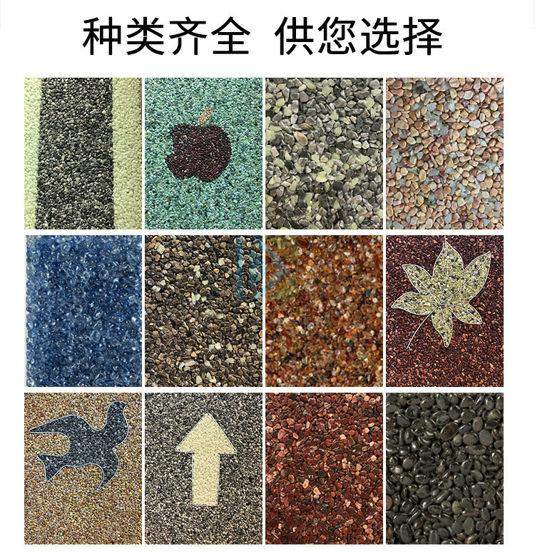 城市广场、市政人行道(步行街)、自行车道、轻型机动车道、停车场、园路、树池、小区、庭院、学校、高尔夫球场、网 球场、游乐场等露天公共场所。胶粘石渗水地面系统持久耐用,防尘,承重,渗水效果好。