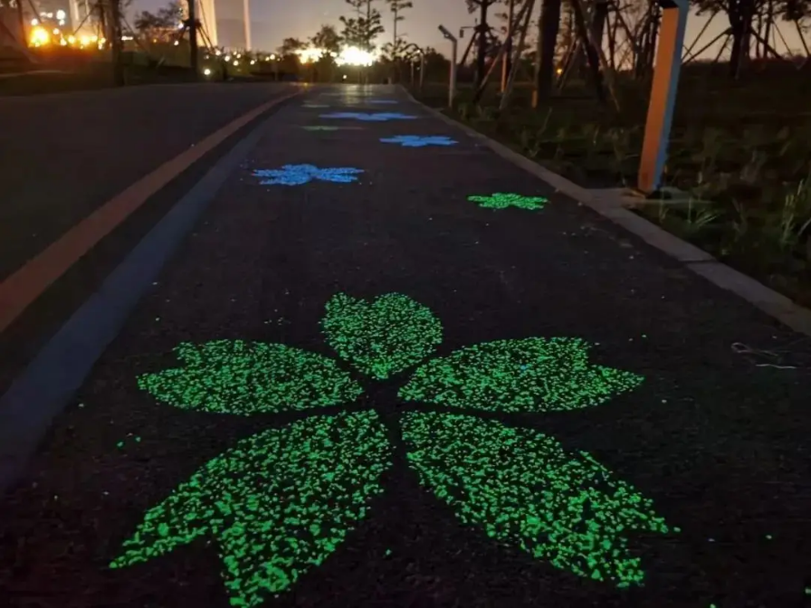 针对绿道的发展,近些年我们开发了一系列的发光碎石、发光鹅卵石和发光标志,还针对绿道路面开发了专用弹性体发光颗粒等园林绿道用的长余辉发光产品。现在已经在全国范围铺开,效果也不错,接受度是越来越高了。