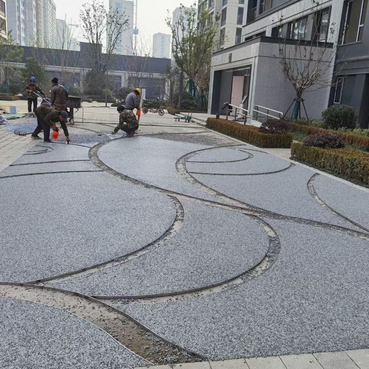胶粘石路面使用的原材料环保、色彩自然、典雅大方,环保经济,是海绵城市发展所需要的材料。其中胶粘石是以进口胶与天然彩色石子经特殊工艺制作而成,具有坚固美观、色泽自然、不易褪色的特点,它是一种新颖的艺术景观铺装材料。