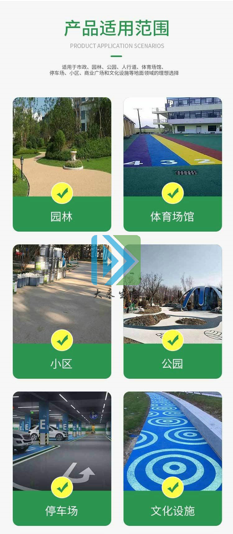 胶粘石透水路面适用范围:园林、城市广场、游泳池、洗浴中心、别墅庭院、室内外装饰、公园健身休闲所等。