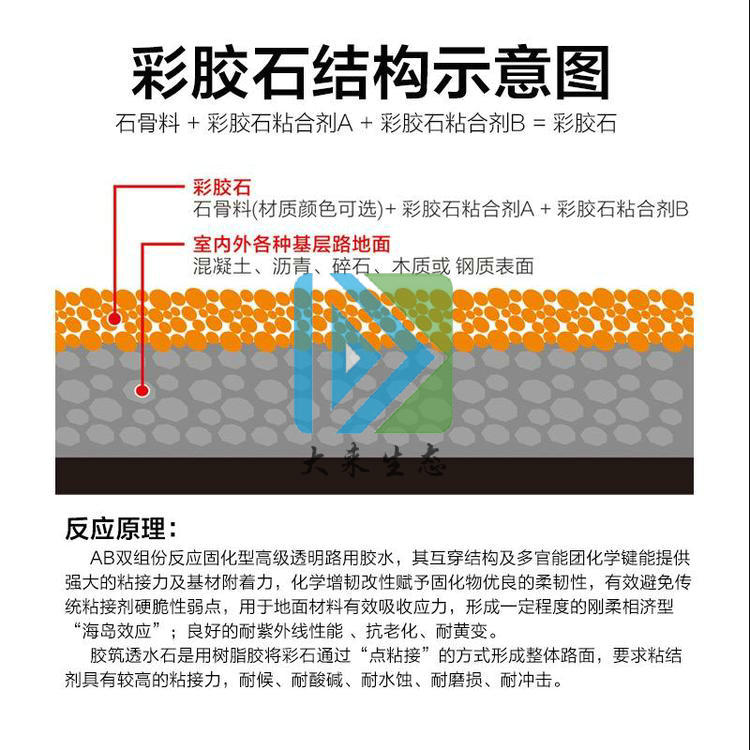 为了降低成本,胶筑透水石路面一般设计成双层结构,基层应达到路面荷载承载的需要,可以是混凝土、透水混凝土或沥青,而胶筑透水石面层一般仅需要20mm-30mm厚,胶筑透水石仅作为装饰面层吸收和传递地面荷载的作用,这样,类似于沥青路面结构的弹性结构将是非常必要的。通常的树脂虽 然可能提供足够的粘结力,但由于解决强度与韧性平衡方面技术限制以及耐候性方面的局限性而难以用于这种路面。