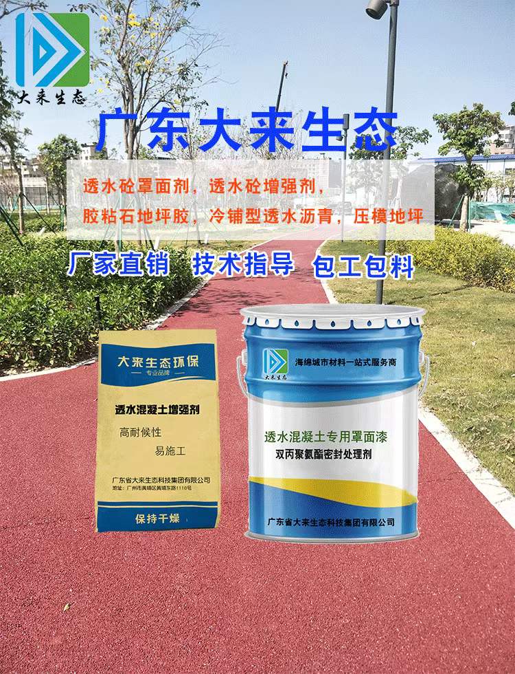 透水混凝土又称多孔混凝土,是由天然骨料、高标水泥、透水专用增强剂和自来水拌制而成的一种多孔轻质混凝土,它不含细骨料。大来生态厂家报价,含税含运费透水专用胶结料报价,专用增强剂厂家直供。广东大来生态科技集团有限公司系透水地坪原材料厂家,可提供增值税发票,全国包邮,提供技术指导,包教包会,欢迎广大透水地坪施工单位或工程承包单位咨询了解。公司拥有大量的施工班组,可提供全国包工包料施工服务。